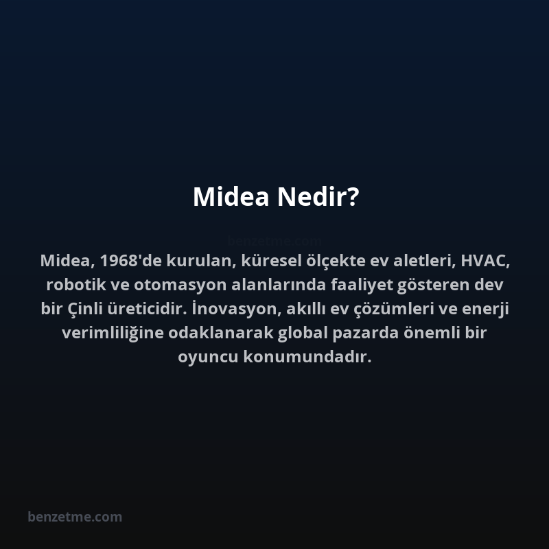 Midea Group, 1968 yılında Çin'in Foshan kentinde kurulmuş, küresel ölçekte faaliyet gösteren devasa bir tüketici elektroniği ve ev aletleri üreticisidir. Başlangıçta küçük bir kapak ve otomobil parçası üreticisi olarak yola çıkan şirket, zamanla stratejik büyüme, uluslararası ortaklıklar ve satın almalar yoluyla ürün portföyünü ve coğrafi erişimini genişletmiştir. Günümüzde Midea, HVAC (Isıtma, Havalandırma ve Klima) sistemleri, beyaz eşya, mutfak aletleri, aydınlatma, robotik ve otomasyon gibi geniş bir yelpazede ürün ve hizmet sunmaktadır. Bu çeşitlilik, şirketi hem B2C (tüketiciye yönelik) hem de B2B (işletmelere yönelik) pazarlarda önemli bir oyuncu haline getirmiştir.